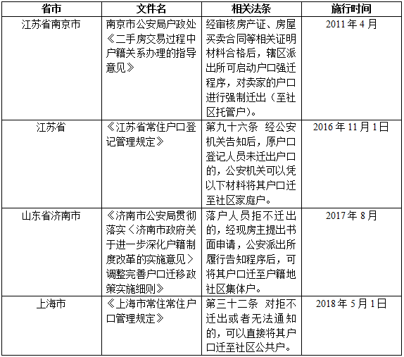 如表格内容所示,至少有四份规范性法律文件为买方向公安机关申请强制迁出卖方户口提供依据。各地表述不同,但总结起来申请强制迁户要经过以下程序:1、申请人已经合法取得房屋所有权,持有关材料向辖区派出所提交申请2、派出所履行告知程序3、原住户拒不迁户或无法告知4、派出所将原住户户口迁至社区公共户。